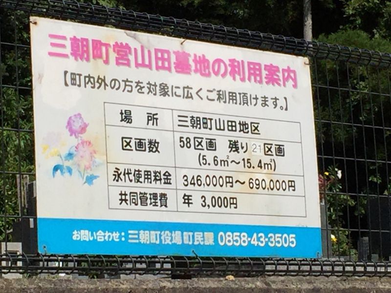 三朝町営 山田墓地(鳥取県三朝町)の価格・評判・バスや車のアクセス・地図情報。お墓探しのlife.(ライフドット)は、鳥取県三朝町の霊園・墓地の中からおすすめのお墓や、ご自宅近くの樹木葬・納骨堂・永代供養墓・一般墓(墓石を建てるお墓)をご提案します。地域別の墓地一覧、費用相場、人気ランキングなど、お墓選びに役立つ情報が満載。三朝町営 山田墓地の評判・口コミや、詳細な交通アクセス・地図、料金・値段もご覧いただけます。民営霊園・公営霊園(市営・都立・都営)・有名寺院、宗教・宗派、ペット供養など、さまざまな特徴から比較して鳥取県三朝町のお墓を探せます。三朝町営 山田墓地の見学予約・資料請求の申込みのほか、墓石購入、お墓の移設、墓じまい後の遺骨の移動先・移す方法についても気軽にご相談ください。